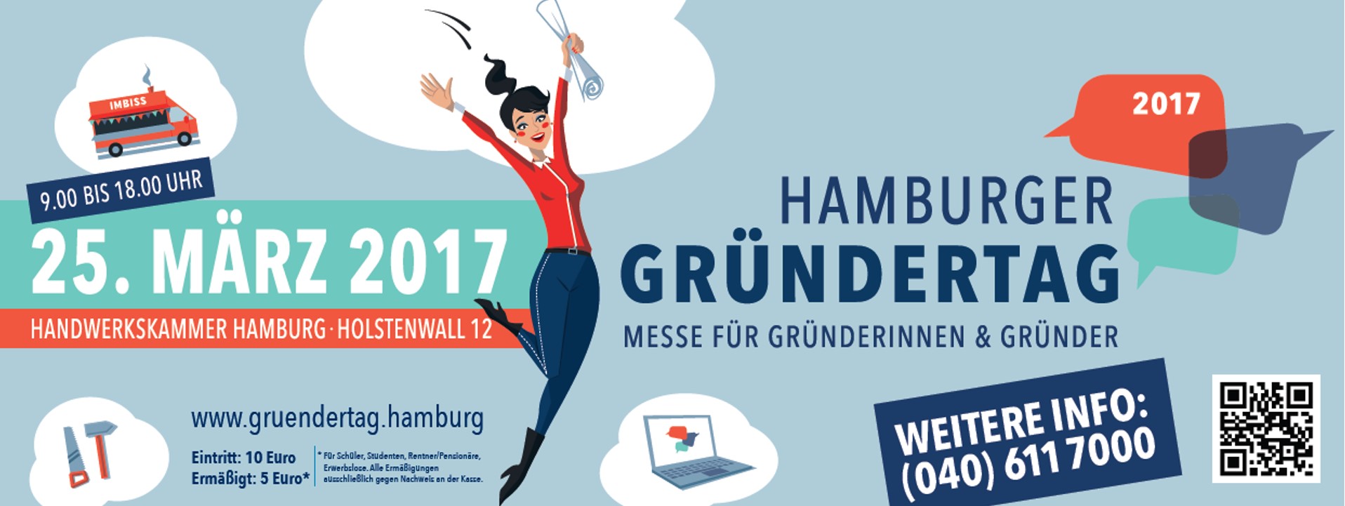 Der Hamburger Gründertag am Samstag, den 25. März 2017 beginnt um 9:00 Uhr und endet mit einem Get-together ab 17:00 Uhr. Veranstaltungsort ist die Handwerkskammer Hamburg, Holstenwall 12, 20355 Hamburg. Tickets können vor Ort für 10 EUR, ermäßigt für 5 EUR erworben werden. Alle weiteren Informationen, eine Programmübersicht und das Ausstellerverzeichnis findet sich auf www.gruendertag.hamburg